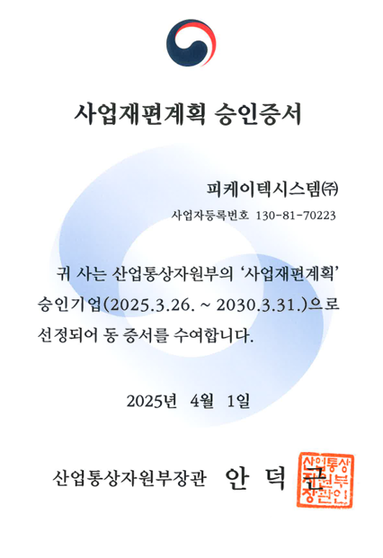 P.K TECH SYSTEM Co.,Ltd received a certificate of Approval for Business Restructuring Plan